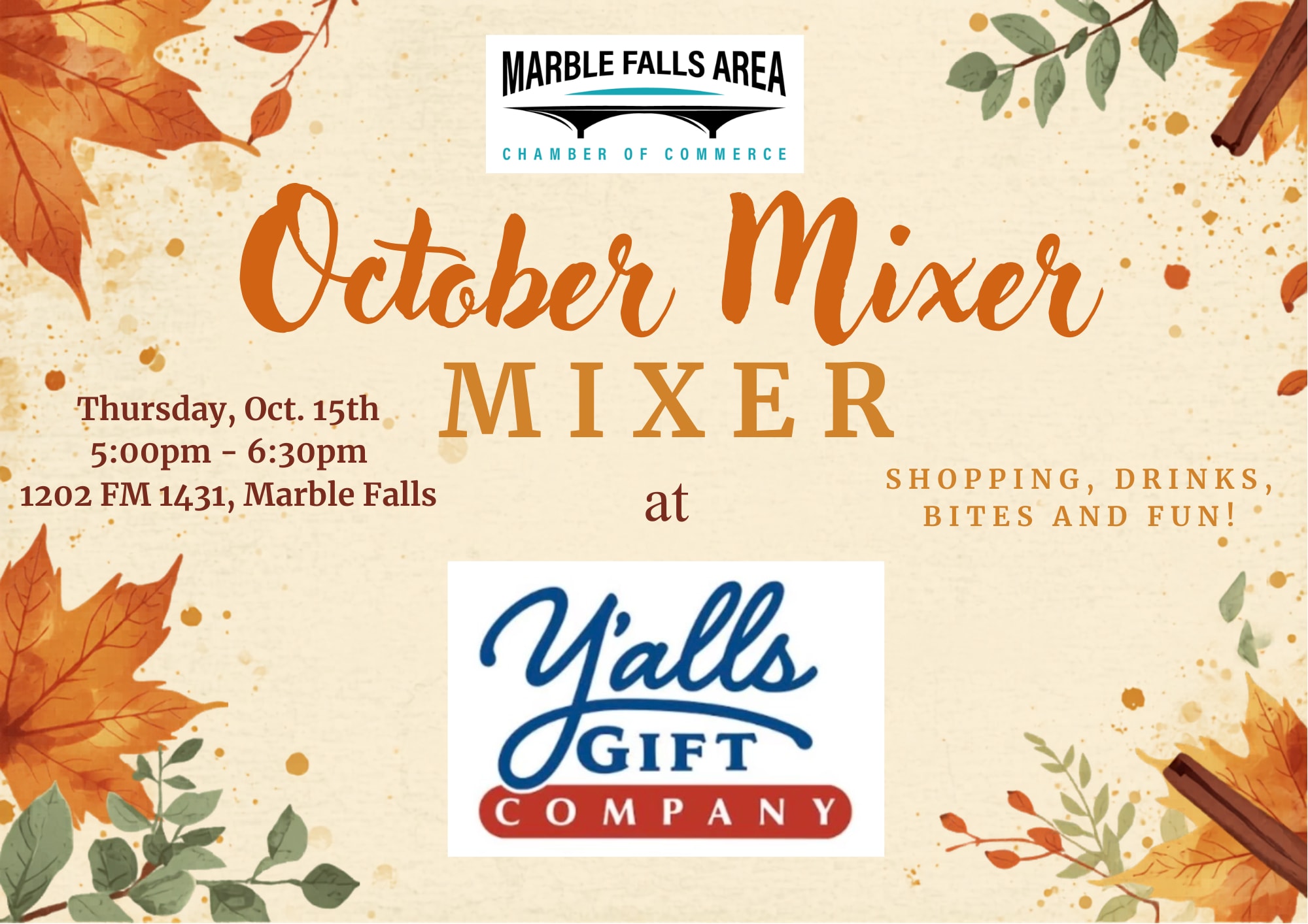 Join the Marble Falls Area Chamber for our October Mixer at Y’alls Gift Company! Enjoy an evening of shopping, drinks, bites, and fun while connecting with fellow Chamber members and supporting a local favorite. Mix, mingle, and celebrate the season!