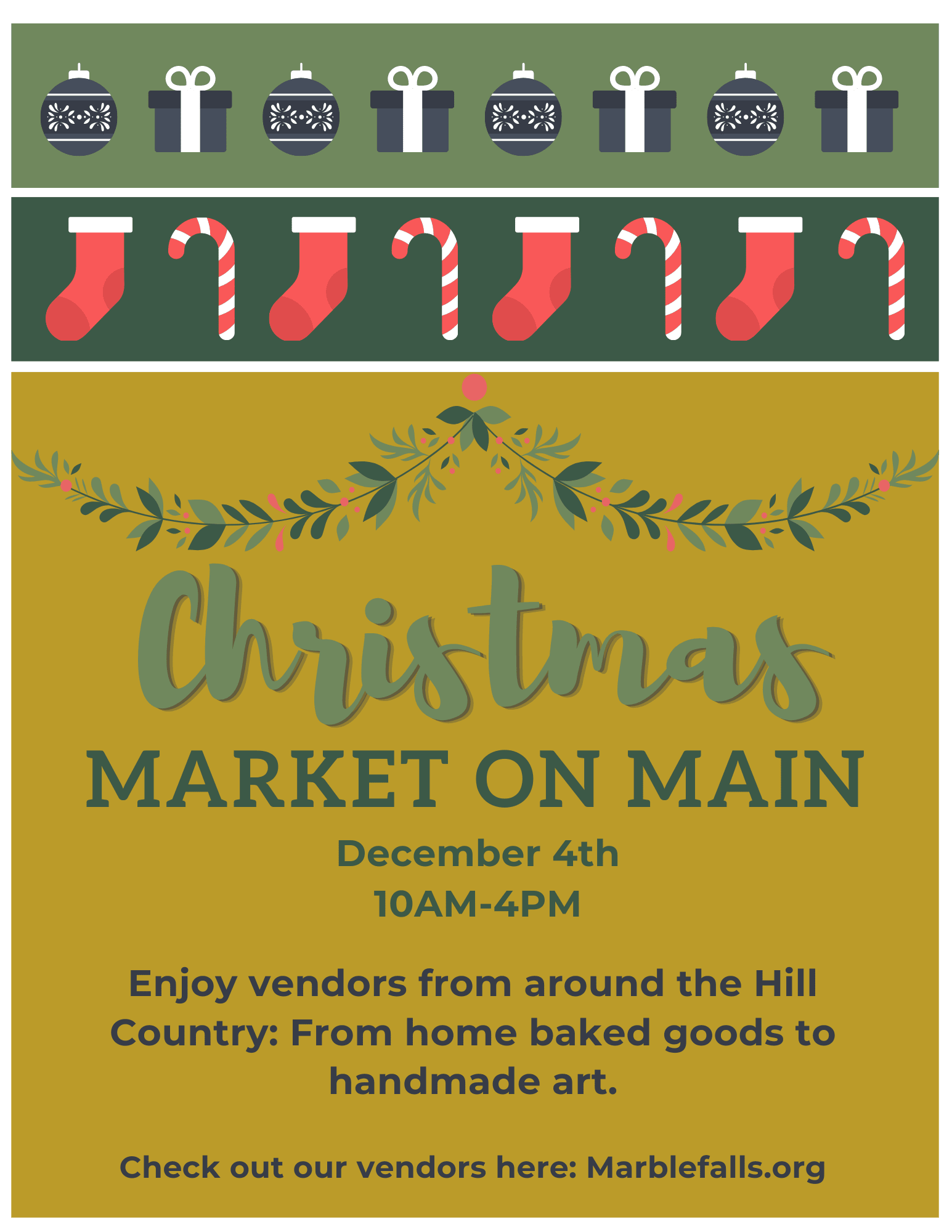 Come join our Christmas Market on Main. Over 50 booths will be selling a variety of charming gifts.