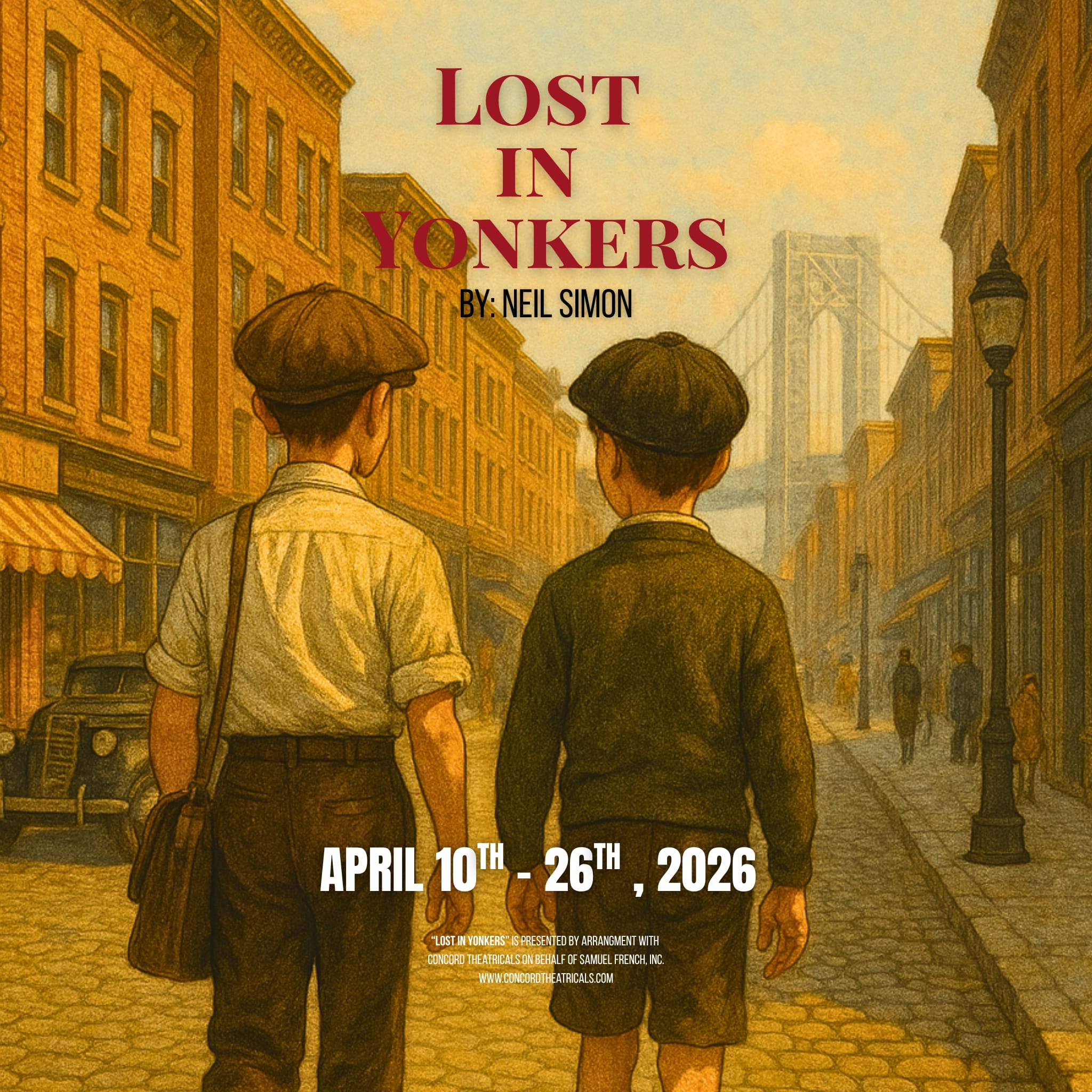 From the brilliant mind of America’s great comic playwright, Neil Simon, comes Lost in Yonkers—a heartfelt, funny, and poignant tale of family, resilience, and unexpected love. Set in 1942 Yonkers, two young brothers are left in the care of their stern grandmother, navigating a world filled with eccentric relatives, including their sweet but mentally challenged Aunt Bella and her secret romance, and their tough-talking Uncle Louie, a small-time hoodlum. Filled with humor and heart, this Tony and Pulitzer Prize-winning classic is a touching coming-of-age story that will leave audiences laughing, crying, and utterly captivated.