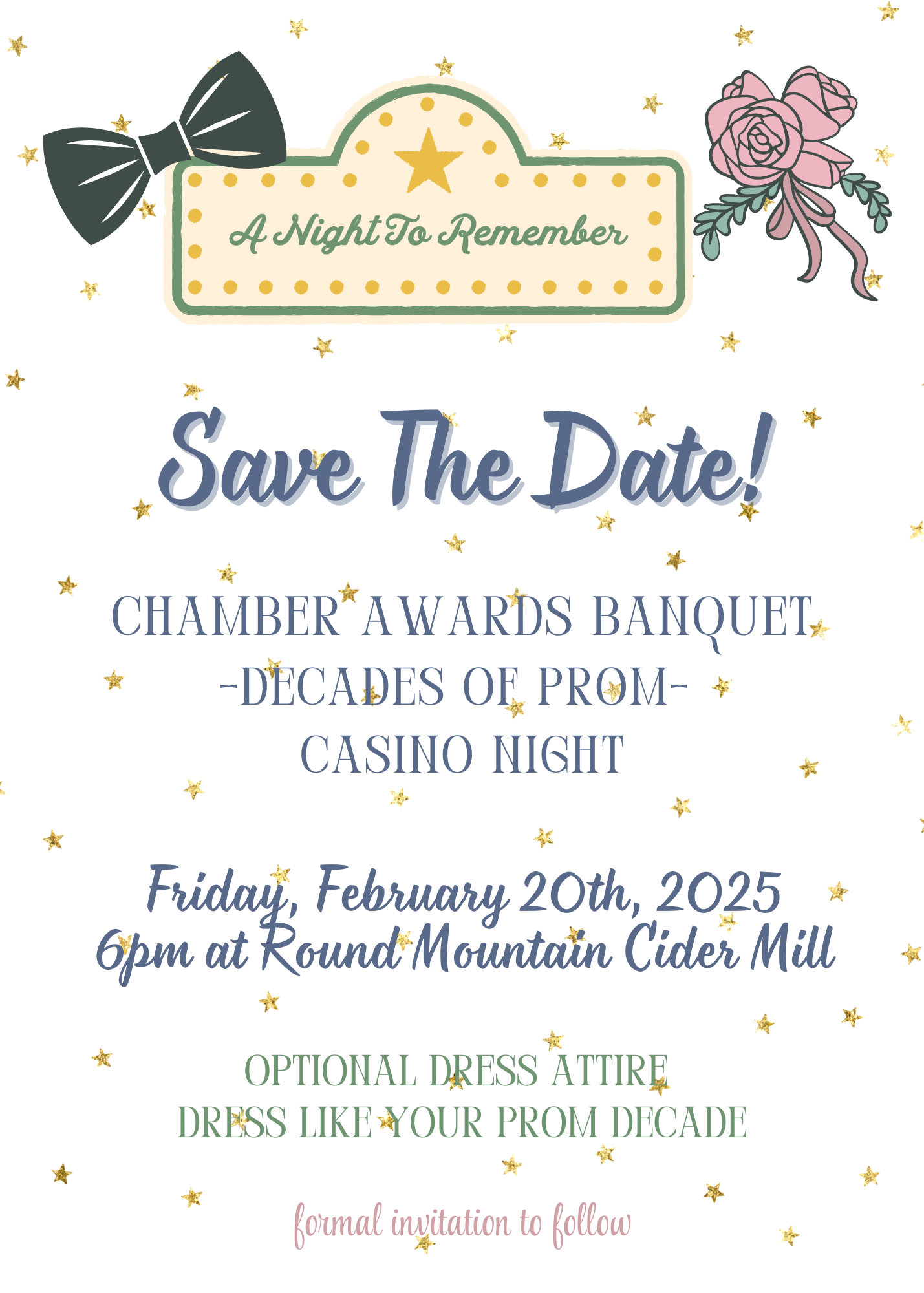 Get ready for an unforgettable evening as we celebrate the outstanding citizens, businesses, and organizations that make our community shine! Join us for our annual Chamber Awards Banquet – Decades of Prom: Casino Night on Friday, February 20th, 2025, at Round Mountain Cider Mill.