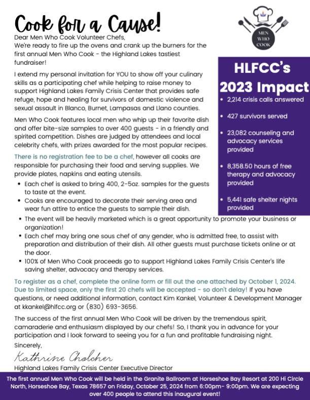 The first annual Men Who Cook will be held in the Granite Ballroom at Horseshoe Bay Resort at 200 Hi Circle North, Horseshoe Bay, Texas 78657 on Friday, October 25, 2024 from 6:00pm-9:00pm. We are expecting over 400 people attend this inaugural event!