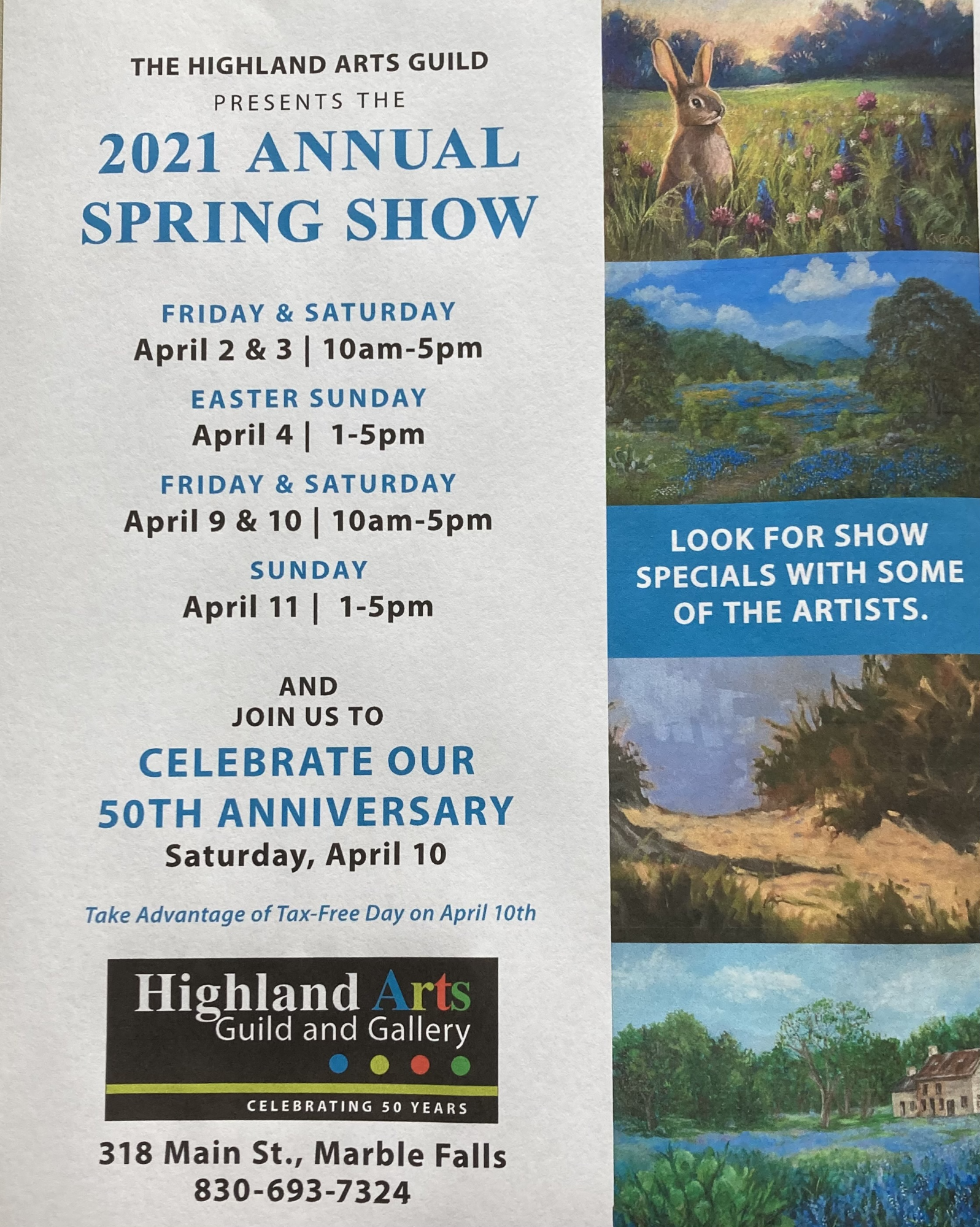 The Highland Art Guild was created in 1971. We are celebrating 50 years as an organization in 2021. Currently we have approximately 60 members - all local artists. We are the largest gallery in the area. Each year we host a Spring Show at the Guild and Gallery. Artists will showcase their art including oil, watercolor, pastels, acrylic and mixed media. During the first two weekends of April we bring in additional art. There will be show specials offered by some artists. We also have a gift shop at the gallery. This year we will also be celebrating our 50th anniversary on Saturday, April 10th. That will also be a tax free day for customers. We will be offering some prizes throughout the day. There will be a larger celebration later in the year. Our organization has decided to have wearing masks be optional. Please come and join us.